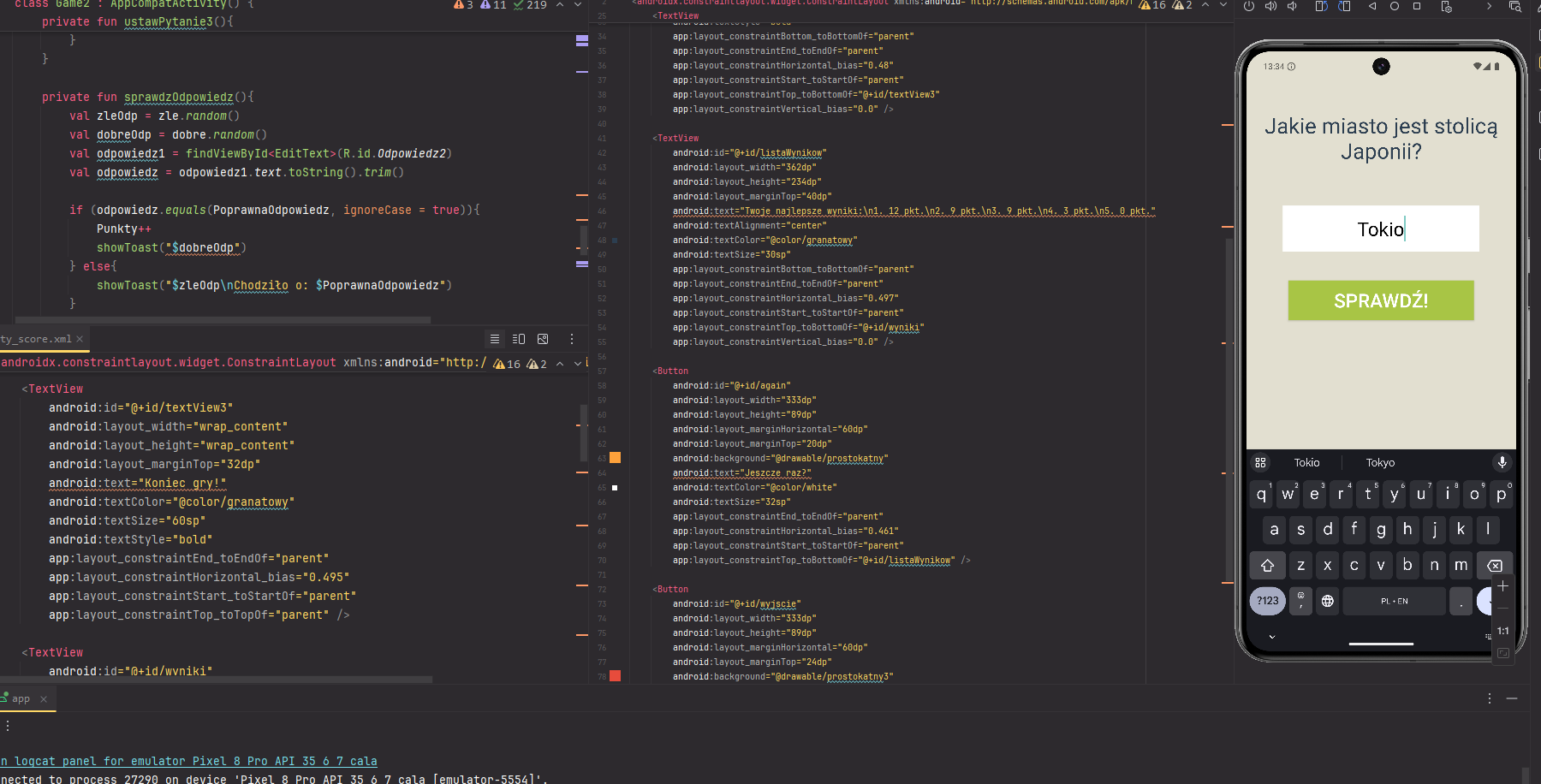 W odróżnieniu od aplikacji "Stolice", ten program powstał w pełni w dedykowanym środowisku Android Studio.