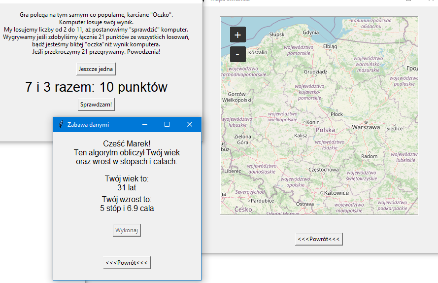 Aplikacja korzysta z repozytorium serwisu GitHub które daje możliwość korzystania z map online. "Oczko" natomiast wykorzystuje narzędzia do generowania losowych liczb. Program ten ilustruje jakie efekty można osiągnąć po około dwóch tygodniach nauki programowania.